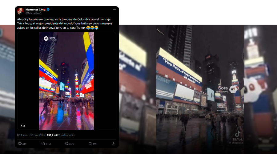 En el Times Square de Nueva York supuestamente instalaron varios letreros luminosos con el mensaje “Viva Petro, el mejor presidente del mundo” y la bandera de Colombia. Pero esto es falso, el video que muestra estas imágenes fue generado con inteligencia artificial.