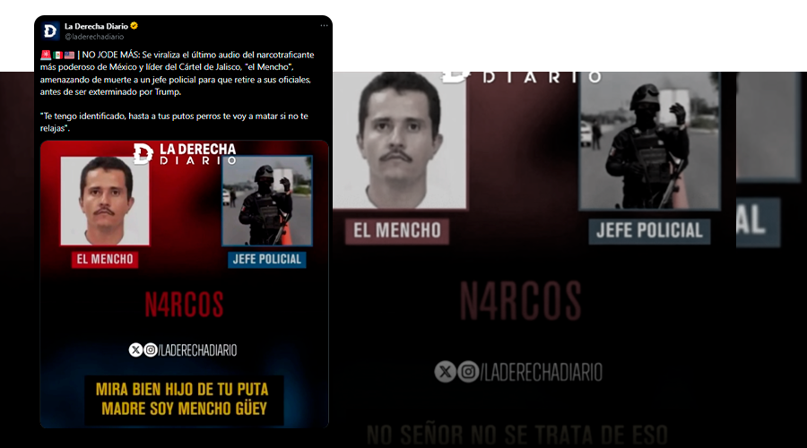 Una de las publicaciones afirma: “NO JODE MÁS: Se viraliza el último audio del narcotraficante más poderoso de México y líder del Cártel de Jalisco, "el Mencho", amenazando de muerte a un jefe policial para que retire a sus oficiales, antes de ser exterminado por Trump. "Te tengo identificado, hasta a tus putos perros te voy a matar si no te relajas" (sic).