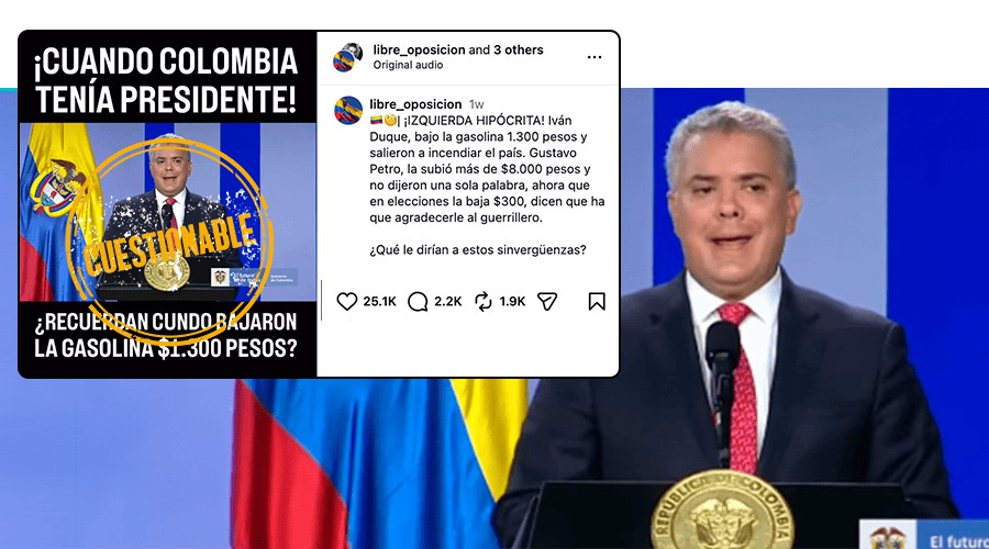 Un video sin contexto del expresidente Iván Duque anunciando la reducción del precio de la gasolina circula con el texto: “¡CUANDO COLOMBIA TENÍA PRESIDENTE! ¿RECUERDAN CUNDO BAJARON LA GASOLINA $1.300 PESOS?” (sic).