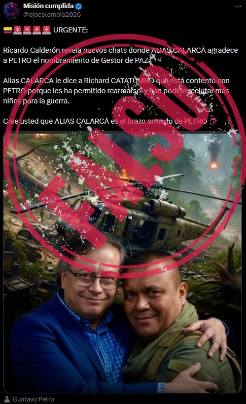 Una publicación falsa del usuario Misión Cumplida (@ojocolombia2026) en X afirma que el periodista Ricardo Calderón, miembro de la Unidad Investigativa de Noticias Caracol, reveló chats donde Alexander Díaz, alias ‘Calarcá Córdoba’, jefe del grupo disidente Estado Mayor de los Bloques y Frente (EMBF), agradece al presidente, Gustavo Petro, su nombramiento como gestor de paz y asegura “que está contento” con él.