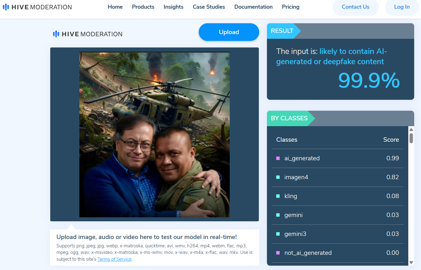 Esta sospecha fue corroborada a través de distintos detectores de esta tecnología, como Hive Moderation, que arrojó un 99.9% de probabilidad de que se trate de una imagen sintética. Así mismo, SightEngine dio una probabilidad del 99% y WasItAI mostró estar muy seguro de que lo mismo.