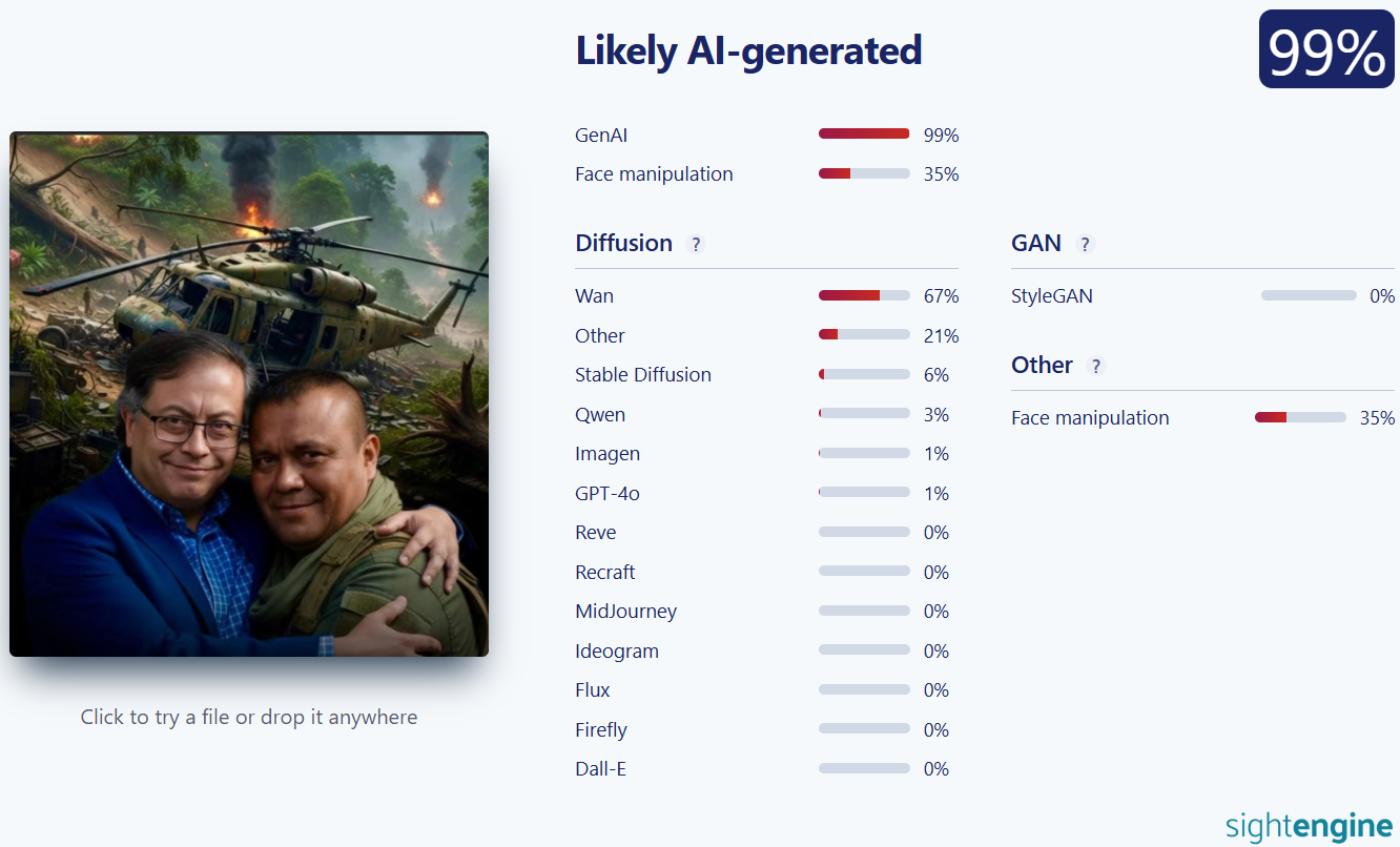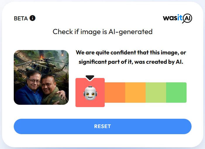 La publicación viral incluye una imagen manipulada que muestra a Petro, vestido con un atuendo formal, abrazando a ‘Calarcá’ con escenas de violencia de fondo, en un paisaje rural. La extrañeza del contexto y los rasgos enrarecidos en el rostro del mandatario sugieren que se trata de una imagen generada con inteligencia artificial (IA).