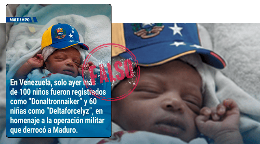 Un usuario nos pidió verificar un titular falso, que circula superpuesto a una imagen de un bebé con una gorra de la bandera venezolana: “En Venezuela, solo ayer más de 100 niños fueron registrados como ‘Donaltronnaiker’ y 60 niñas como ‘Deltaforcelyz’, en homenaje a la operación militar que derrocó a Maduro”.