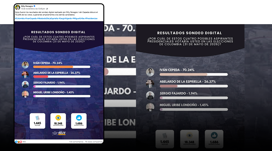 En redes sociales circula la afirmación de que el candidato a la presidencia Iván Cepeda obtuvo el 70,24% de los votos en un sondeo digital realizado por la cuenta denominada Billy Penagos, quien en su descripción menciona que es comunicador social y periodista y que cuenta con cerca de 32 mil seguidores.