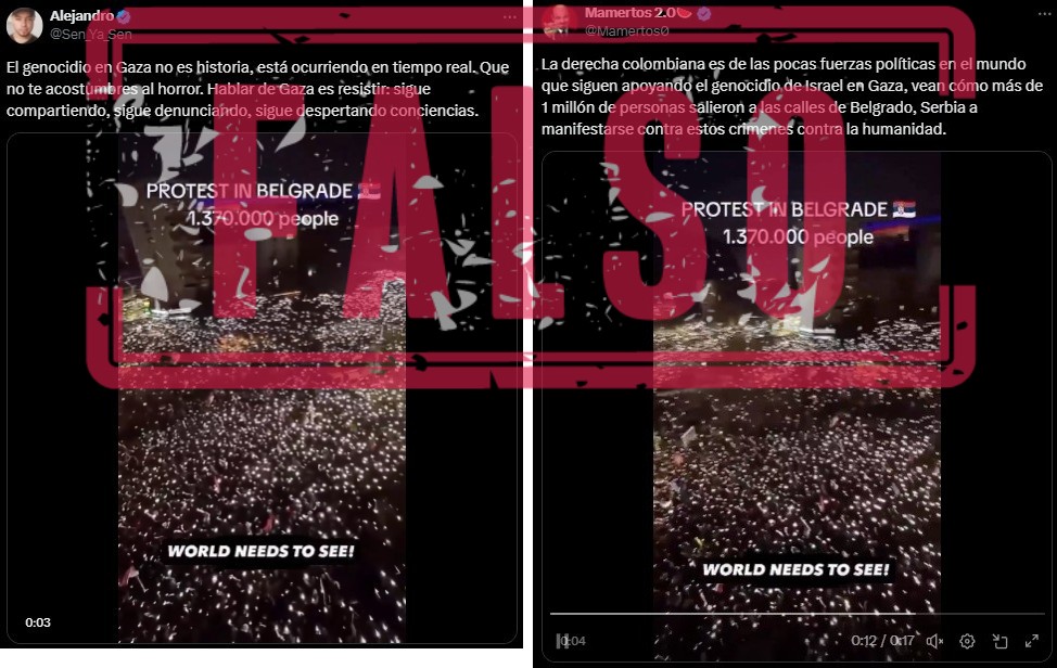 Las cuentas de X @Mamertos0 y @Sen_Ya_Sen hicieron publicaciones en las que establecieron una falsa relación entre un video de una manifestación multitudinaria en Belgrado, Serbia, con la afirmación de que supuestamente más de un millón de personas salieron a protestar contra el documentado genocidio de Israel en Gaza.