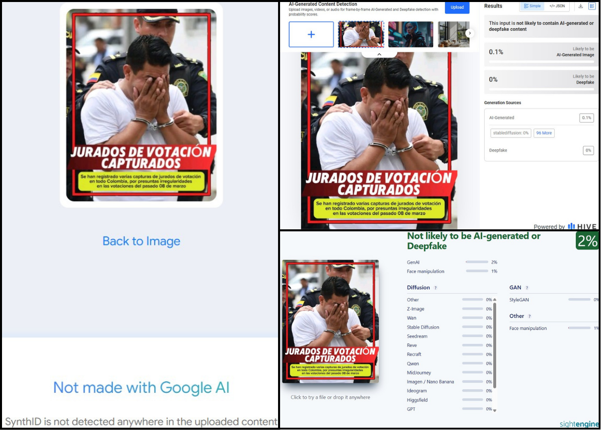 Pasamos la imagen por detectores especializados en inteligencia artificial (IA) como Hive Moderation, Sight Engine y Synth ID Detector, pero estos no mostraron probabilidades de creación con estas tecnologías.