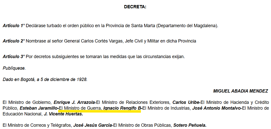 Prueba de ello es el nombramiento del general como jefe civil y militar en la Provincia de Santa Marta, realizado mediante el Decreto Legislativo 1 del 5 de diciembre de 1928, día previo al inicio de la masacre. En dicho documento se destaca la presencia del “Ministro de Guerra, Ignacio Rengifo B”.