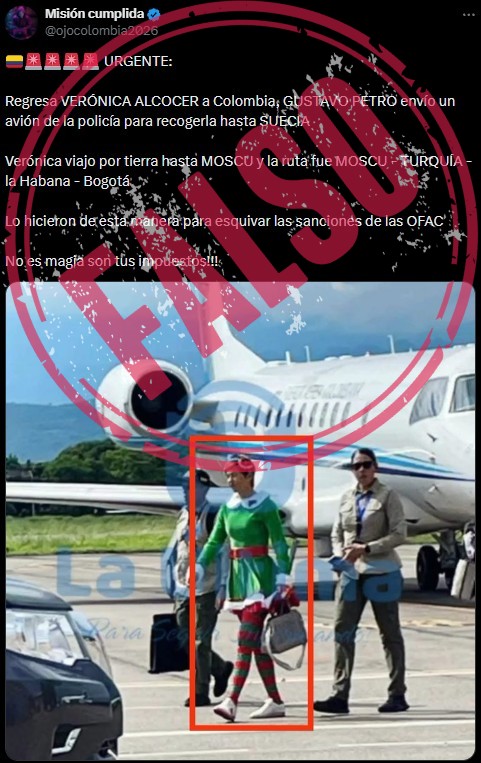 Un lector nos pidió verificar una publicación de la cuenta de X ‘Misión Cumplida’ (@ojocolombia2026) con una foto de la primera dama, Verónica Alcocer, disfrazada de duende navideña, con un mensaje falso que dice que regresó al país en un “avión de la policía” tras un periplo por varios países “para esquivar las sanciones de las OFAC” (sic), la Oficina de Control de Activos Extranjeros de Estados Unidos.