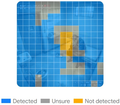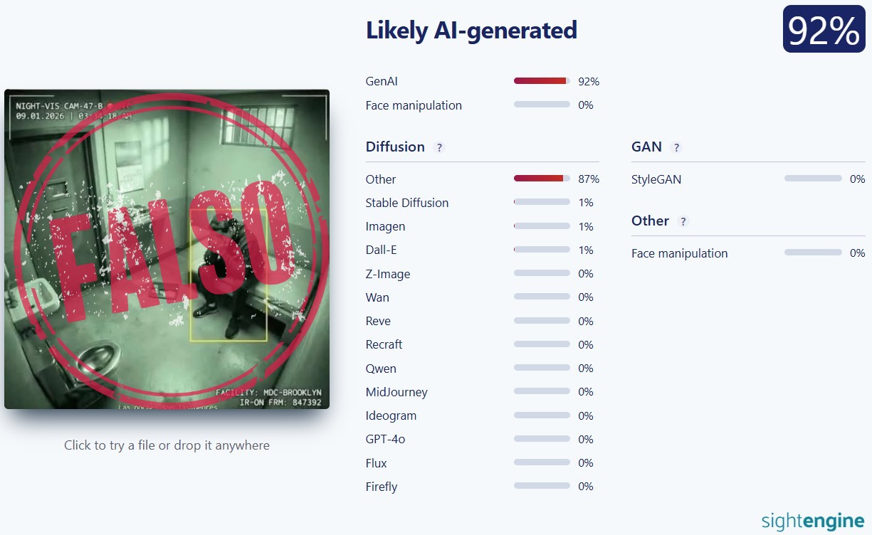 Una imagen falsa muestra supuestamente al depuesto gobernante de Venezuela, Nicolás Maduro, en el interior de su celda en Nueva York como si fuera la toma de una cámara de seguridad en visión nocturna.