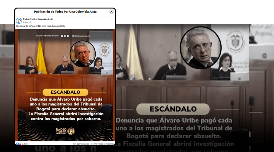 Igual que otra desinformación similar, esta circula desde el 22 de octubre, o sea después de que el Tribunal Superior de Bogotá absolvió en segunda instancia al expresidente Uribe en su proceso por los delitos de soborno en actuación penal y fraude procesal, que la Fiscalía buscará llevar a casación. Las publicaciones en Facebook y X suman más de 13.000 reacciones y más de 7.000 compartidos.
