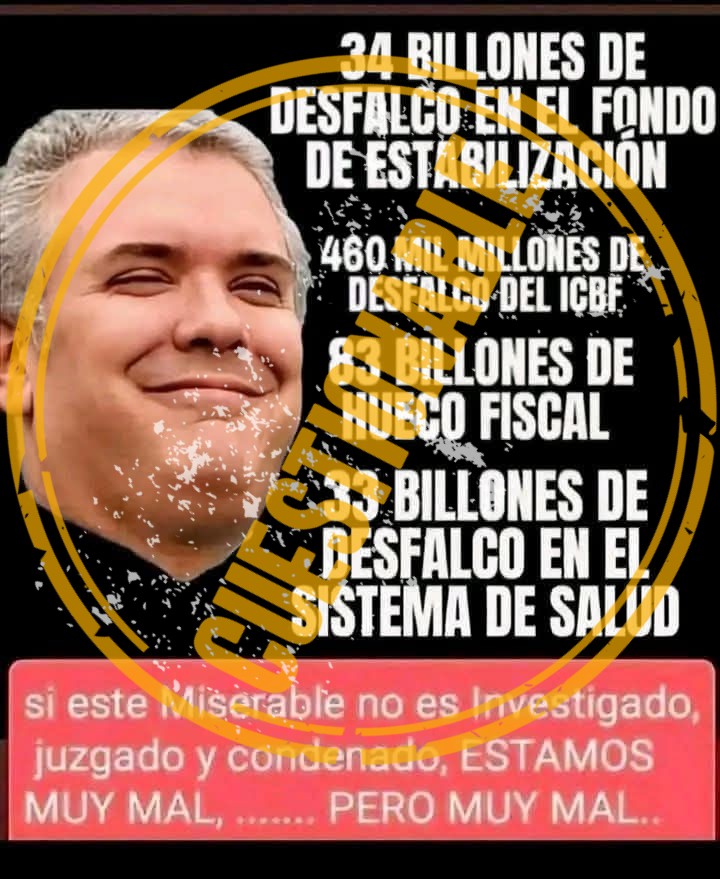 Un lector nos pidió, a través del Gato Chequeabot, verificar una imagen que presenta una foto del expresidente Iván Duque junto a un balance engañoso de supuestos “desfalcos” ocurridos en su gobierno:
