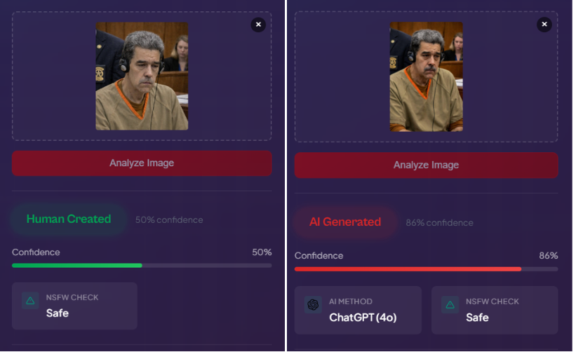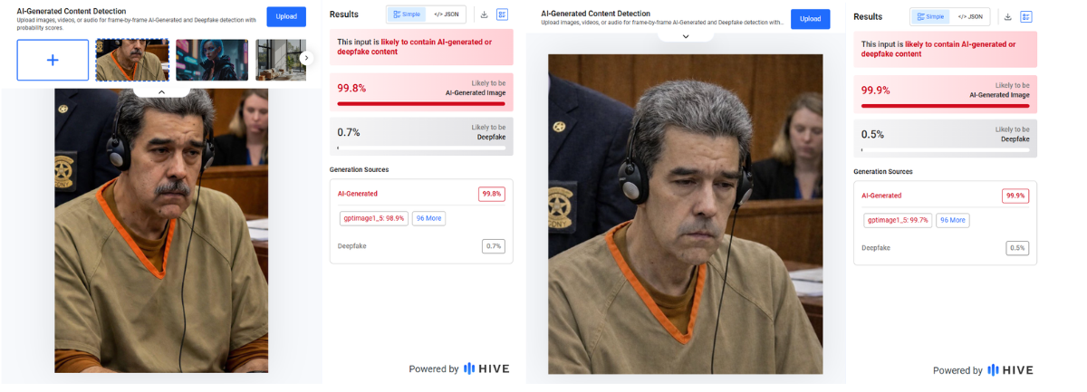 Como no hay ningún registro de las fotos falsas, sospechamos que se podría tratar de inteligencia artificial, así que las analizamos como Hive Moderation e Is it IA?, y arrojaron distintos resultados. La primera indicó que había un 99% de probabilidad de que las dos fotos falsas fueran un contenido sintético, posiblemente generado con ChatGPT. Por otro lado, Is it IA? arrojó que la de Maduro era posiblemente real, mientras que la otra no.