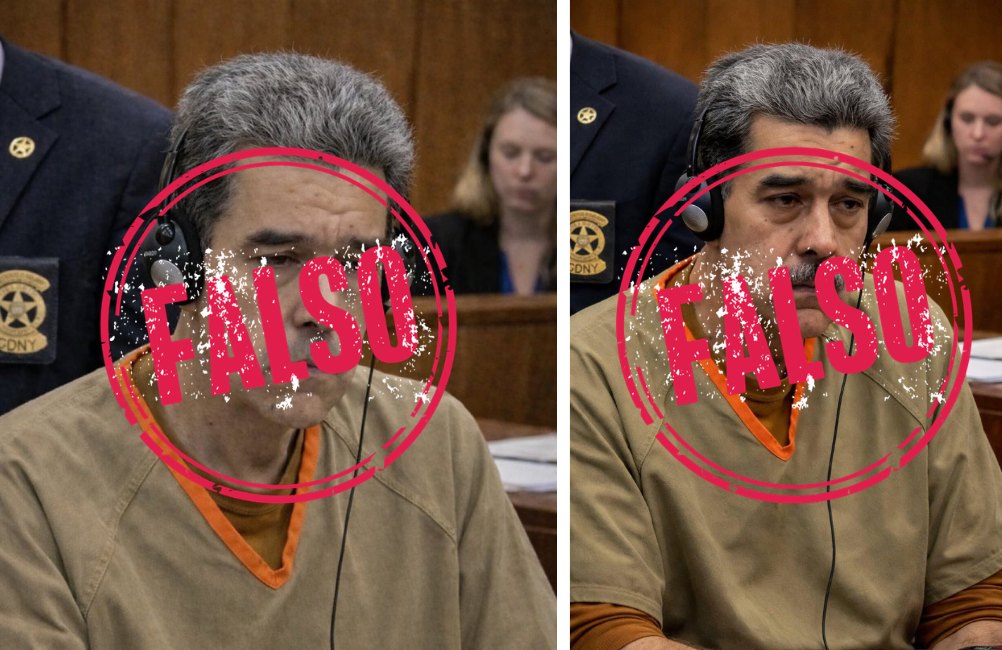 Dos fotos falsas muestran al derrocado mandatario venezolano Nicolás Maduro en una audiencia de su juicio por narcoterrorismo ante un tribunal federal de Estados Unidos, pero en una aparece sin bigote y en otra aún lo tiene.