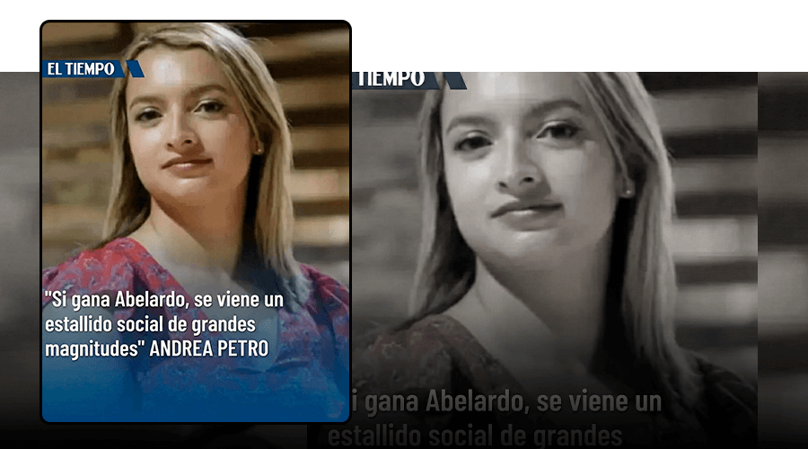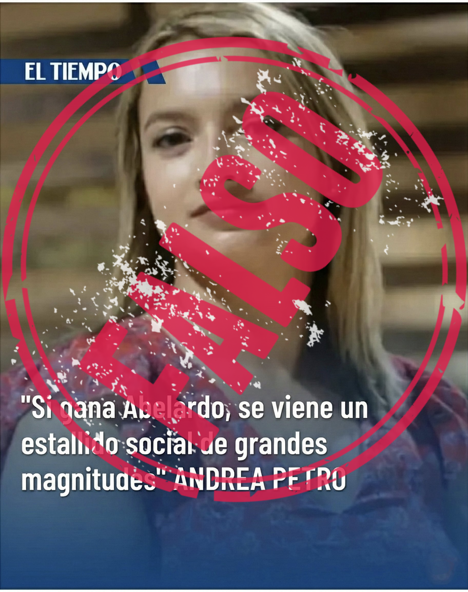 Una imagen falsa con el logo de El Tiempo incluye una fotografía de Andrea Petro, hija del presidente, Gustavo Petro, acompañada de la cita textual atribuida a ella: “Si gana Abelardo se viene un estallido social de grandes magnitudes” (sic), en referencia a De la Espriella, precandidato presidencial del grupo opositor Defensores de la Patria.
