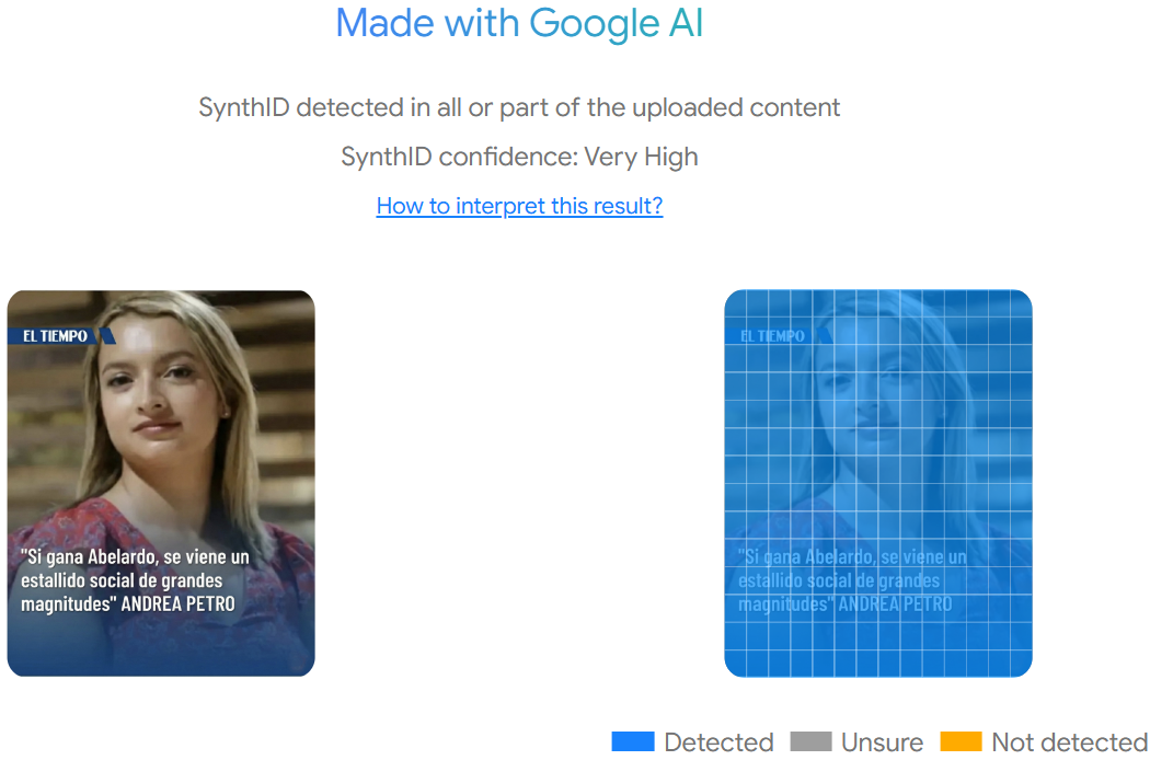Para confirmar esa pista, empleamos el SynthID Detector, una herramienta que identifica marcas de agua digitales imperceptibles a simple vista que las tecnologías de Google DeepMind añaden a los contenidos creados por sus modelos de IA. El resultado fue positivo para manipulación total por inteligencia artificial.