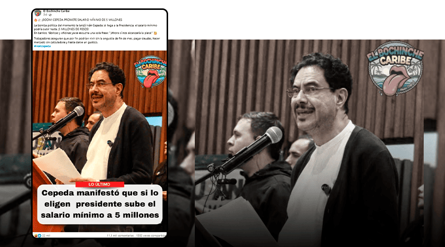 Sin embargo, la afirmación es falsa. No hay evidencia de tal promesa, y la imagen que circula es un montaje basado en otra publicación. Cepeda únicamente ha respaldado el aumento del salario mínimo decretado por el Gobierno para 2026.