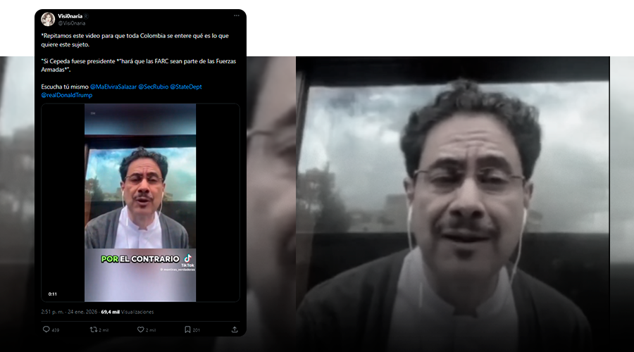 En un video falso, el senador y precandidato presidencial del Pacto Histórico, Iván Cepeda, parece decir: “Es totalmente falso que en un eventual gobierno de mi parte acabaré con las Fuerzas Armadas de Colombia; por el contrario, se verán reforzadas porque las FARCS serán parte de ellas para defender esta nación” (sic).