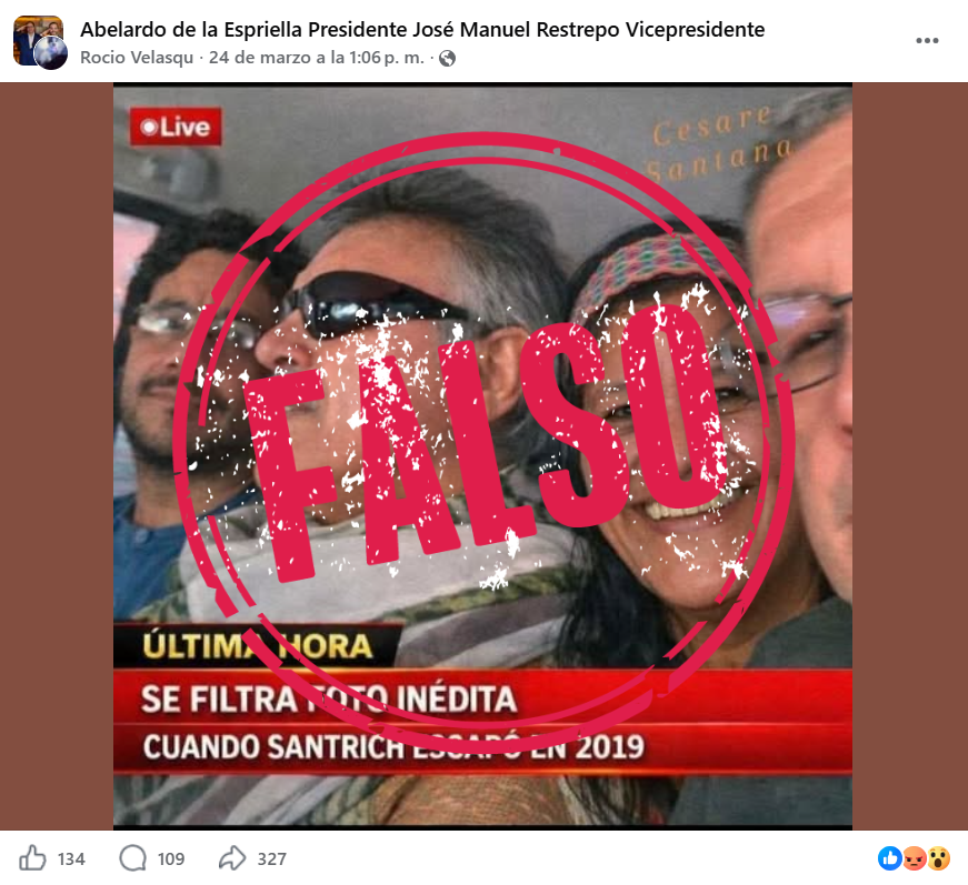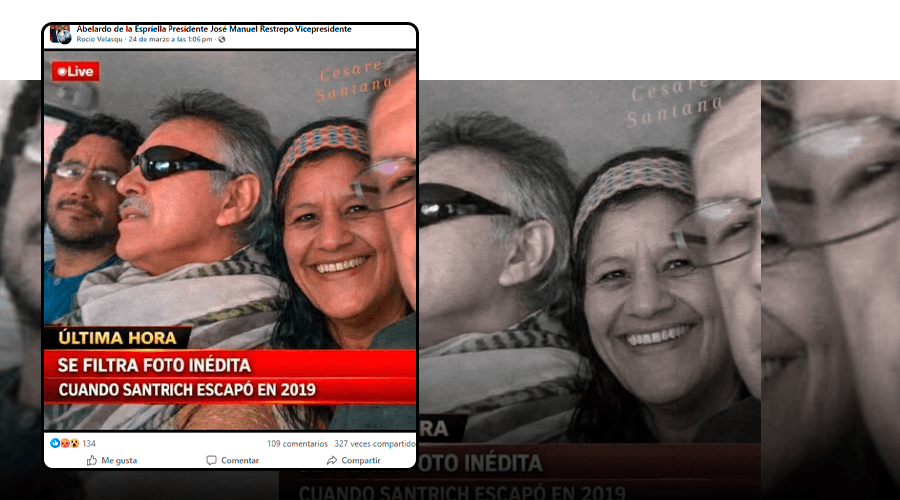 Además, tiene superpuesto un aparente titular de “última hora” que dice: “Se filtra foto inédita de cuando Santrich escapó en 2019”.