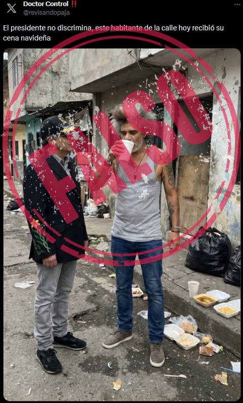 En la escena, ambos aparecen de pie en una calle sucia y con rastros de abandono, mientras el músico sostiene un vaso de icopor. La publicación en la que apareció originalmente la imagen, que es falsa, tiene el siguiente mensaje: “Gustavo Petro en las calles compartiendo con los habitantes de la calle. Que hermoso mi Presi! 🙏🏼✨️”.