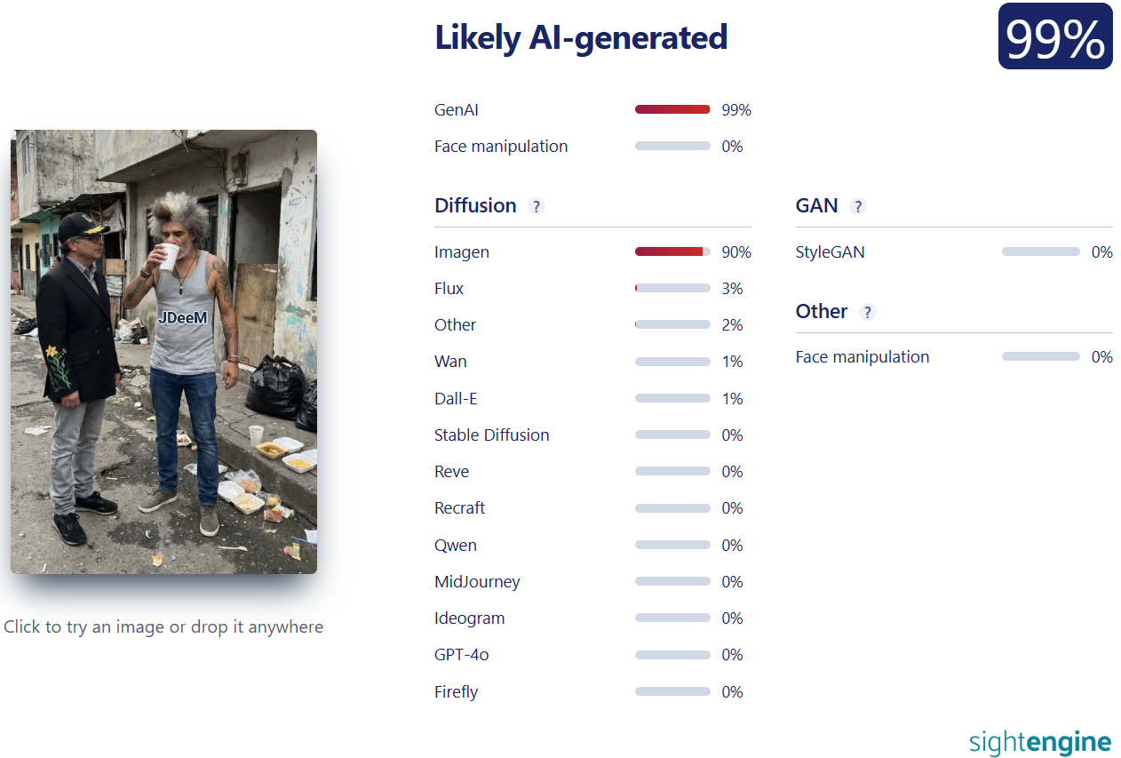 Tras realizar una verificación técnica, concluimos que es producto de la inteligencia artificial (IA), como lo detectaron varias herramientas y se evidencia en algunos detalles. Además, no existe registro de este encuentro. En cambio, el montaje se originó en una página de memes políticos en Facebook.
