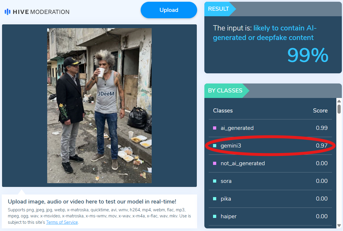 El detector de Sight Engine arrojó un 99% de probabilidades de que la imagen hubiese sido generada con inteligencia artificial. La herramienta de Hive Moderation coincidió con ese porcentaje, pero sumó además que habría sido creada con la tecnología Gemini 3, de Google.