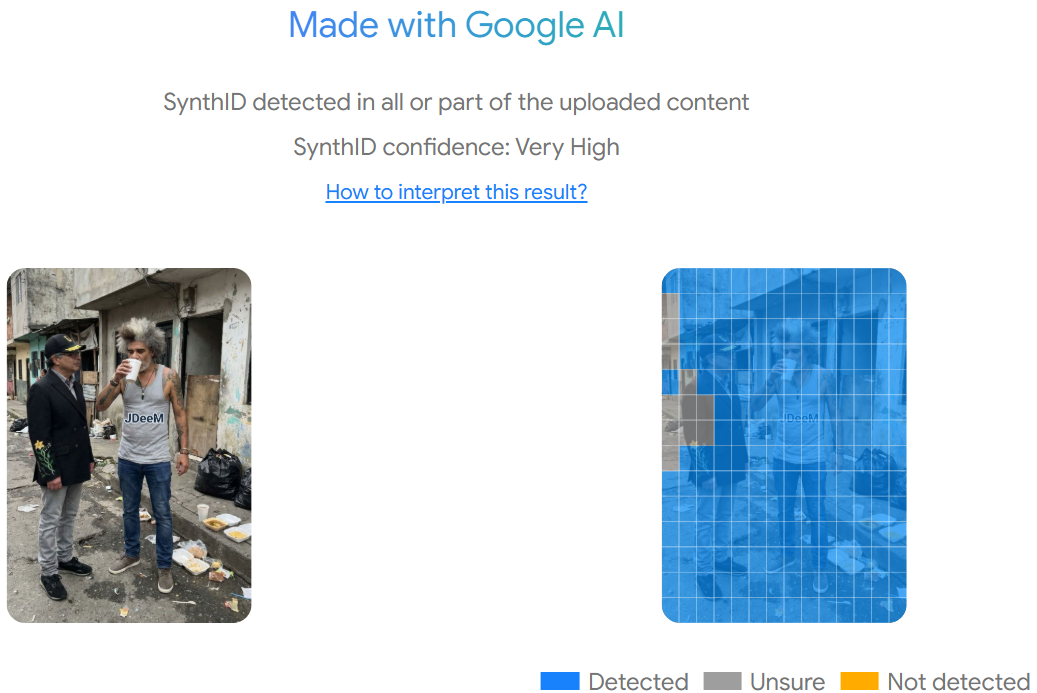 Para confirmar esto último, empleamos el SynthID Detector, una herramienta que identifica marcas de agua digitales imperceptibles que las tecnologías de Google DeepMind añaden a los contenidos creados por sus modelos de IA. El resultado fue positivo para manipulación total por inteligencia artificial.