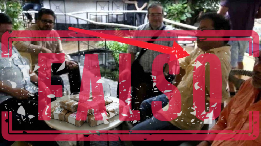 Se trata de un montaje. En la imagen original, que data del proceso de paz entre el Gobierno y esa guerrilla en 2016, solo aparecen vasos y aperitivos sobre el mueble, no droga.