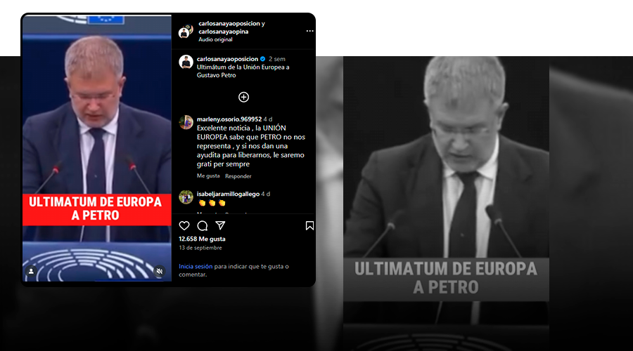 El video fue compartido por Carlos Luis Anaya, influenciador y excandidato al concejo de Floridablanca, Santander, por el partido Centro Democrático, a través de su cuenta de Instagram (@carlosanayaoposicion). Él aparece luego del clip y asegura: “Mucha atención que la Unión Europea acaba de mandarle un ultimátum a Gustavo Petro Urrego (...). Quiero que escuchen las declaraciones de la Unión Europea y toda Colombia a difundir”.