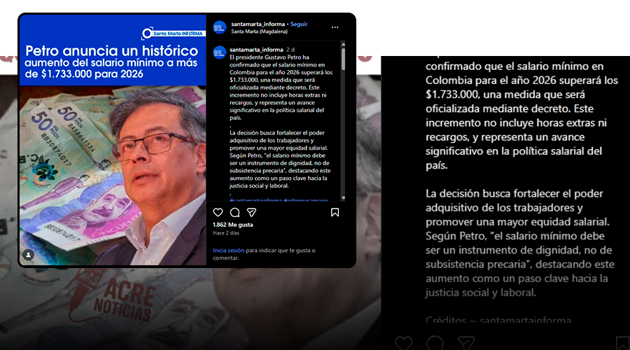 Publicaciones en redes sociales afirman que el presidente Gustavo Petro comunicó que el ingreso mínimo de 2026 será “fijado por decreto y superará los $1.733.000, sin incluir pagos por horas extras ni recargos”. Además, que el mandatario habría dicho: “el salario mínimo debe ser un instrumento de dignidad, no de subsistencia precaria”.
