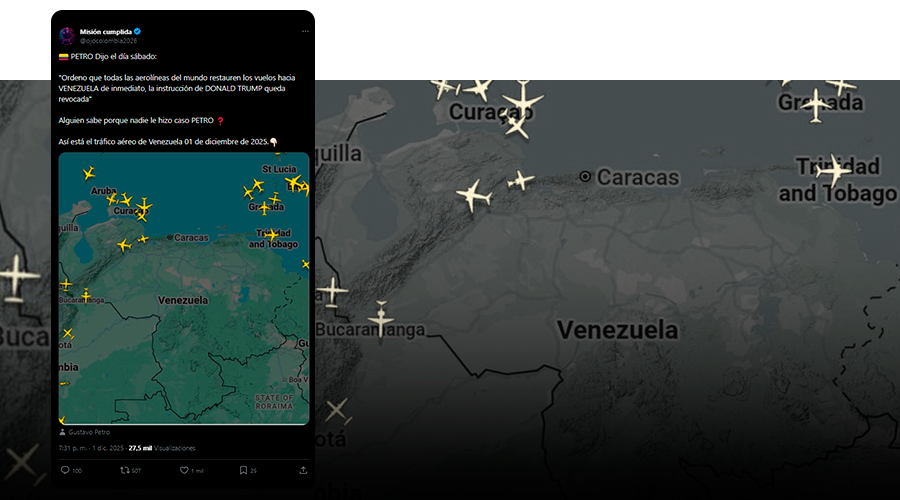 En X se viralizó un trino de la cuenta ‘Misión cumplida’ (@ojocolombia2026) en el que se asegura que el presidente, Gustavo Petro, supuestamente dijo que “ordenaba” que todas las aerolíneas del mundo restauraran los vuelos a Venezuela. Luego, se pregunta sarcásticamente: “Alguien sabe porque nadie le hizo caso a PETRO?” (sic), y finalmente, adjunta una captura de pantalla del tráfico aéreo en Venezuela.