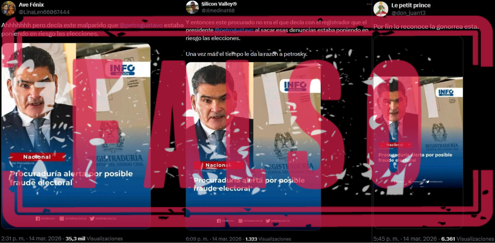 Una imagen con el titular “Procuraduría alerta por posible fraude electoral”, que tiene el logo de la página de noticias InfoNación, circula en publicaciones falsas de cuentas afines al gobierno de Gustavo Petro que sugieren que, con este pronunciamiento, el Ministerio Público finalmente le dio la razón al presidente sobre la existencia de supuestas irregularidades en las votaciones del 8 de marzo.