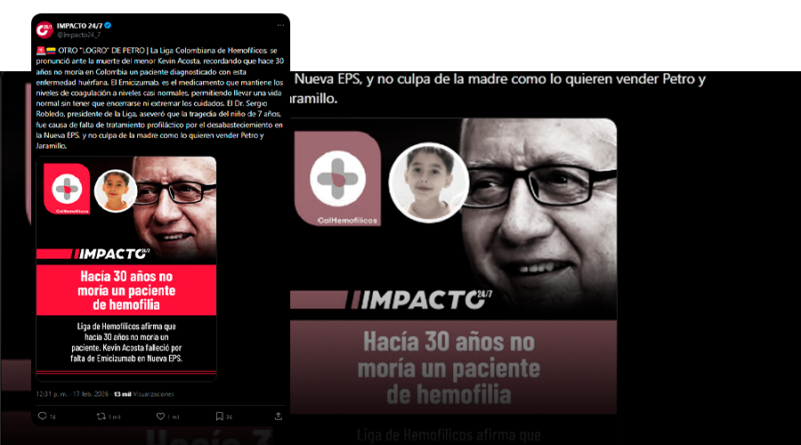 Hicimos una búsqueda en Google y encontramos que el 17 de febrero Blu Radio publicó una nota titulada: “Desde hacía 20 años no moría un paciente por hemofilia”: Liga de Hemofílicos por caso Kevin Acosta”. El artículo resume una entrevista que ese medio le hizo al doctor Sergio Robledo sobre la muerte de Kevin Acosta.