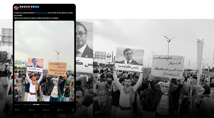 La foto fue compartida en Colombia por cuentas petristas en X, Facebook y TikTok. Algunas de ellas sugirieron que era una reacción al discurso del mandatario en la Asamblea General de las Naciones Unidas, donde criticó el documentado genocidio israelí contra la población palestina en la franja de Gaza.