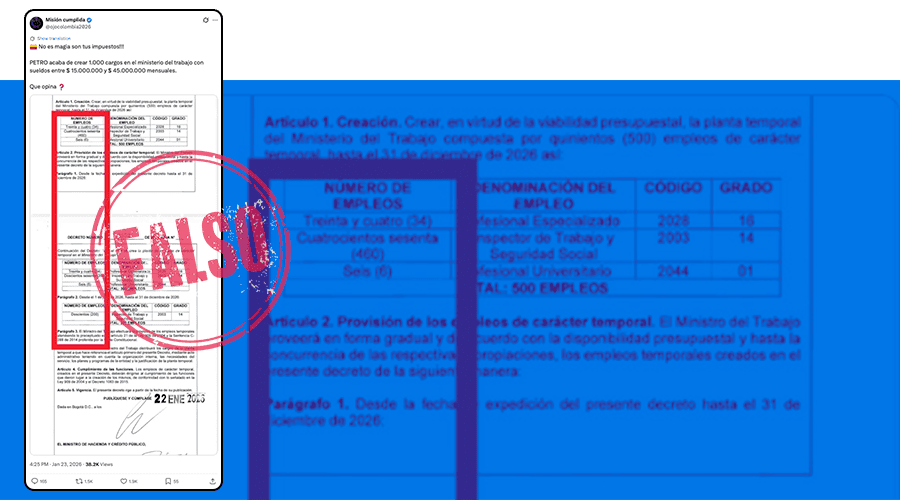 La desinformación surge de una lectura tergiversada del Artículo 2°, que segrega ese número de cargos, explicando cómo se abrirán de forma gradual: un primer grupo de 300 empleos y un segundo parágrafo que detalla los 200 restantes. El usuario ‘Misión cumplida’ combinó los datos de manera engañosa para dar a entender que se creó el doble de puestos.