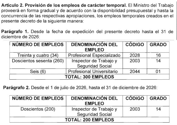 El Decreto 0052 del 22 de enero de 2026 establece, en su Artículo 1°, que se creará una planta temporal compuesta por quinientos empleos, fundamentada en los requerimientos de implementación de la Reforma Laboral.