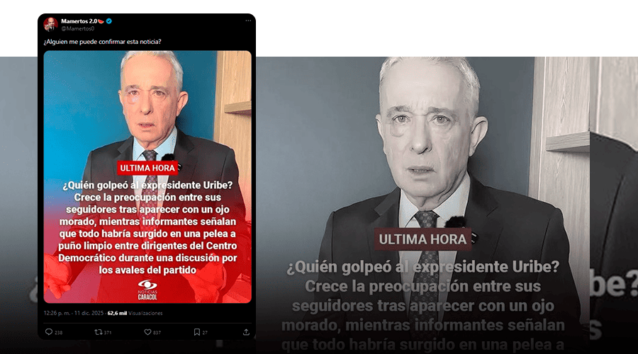 Una imagen del expresidente Álvaro Uribe con un aparente moretón en su ojo derecho circula con el texto superpuesto de un titular atribuido de forma falsa a Noticias Caracol sobre una “pelea a puño limpio” entre dirigentes del Centro Democrático:
