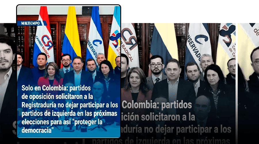 La imagen viral afirma que partidos de oposición solicitaron a la Registraduría impedir la participación de partidos de izquierda en las próximas elecciones para “proteger la democracia”. Sin embargo, tras revisar el sitio web y las redes sociales de El Tiempo, no encontramos ninguna noticia al respecto.
