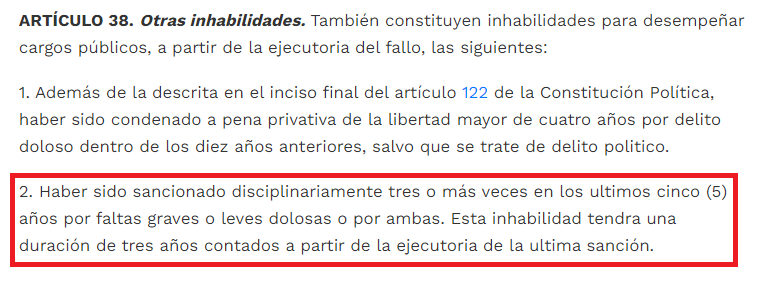 Para verificar esta afirmación consultamos la Ley 734 del 2002 en la cual se puede encontrar el artículo 38 citado en el trino, el cual establece otras inhabilidades a funcionarios para desempeñar cargos públicos. El numeral 2 explica el motivo de inhabilidad al que se refiere la publicación de redes: “Haber sido sancionado disciplinariamente tres o más veces en los últimos cinco (5) años por faltas graves o leves dolosas o por ambas. Esta inhabilidad tendrá una duración de tres años contados a partir de la ejecutoria de la última sanción.”
