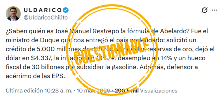 Cuando el gobierno Duque pidió un crédito de 5.000 millones de dólares al Fondo Monetario Internacional (FMI), Restrepo aún no estaba al frente de la cartera de Hacienda, encargada de esto, sino que encabezaba la de Comercio. Esa afirmación sobre el gobierno Duque ya había sido difundida en X por el usuario Uldarico (@UldaricoChilito) en octubre de 2022 y en su momento la chequeamos aquí.