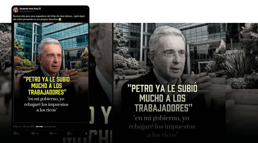 La desinformación también se expone como si Uribe hiciera una promesa de campaña al decir, “en mi gobierno, yo rebajaré los impuestos a los ricos”. Sin embargo, con la legislación actual, el líder del Centro Democrático no puede lanzarse de nuevo a la presidencia, ni siquiera como fórmula vicepresidencial.