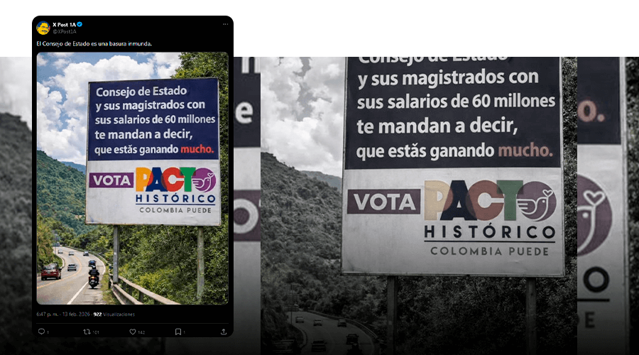 En redes sociales circula la imagen de una supuesta valla publicitaria al costado de una carretera que invita a votar por el Pacto Histórico y dice: “Consejo de Estado y sus magistrados con sus salarios de 60 millones te mandan a decir, que estás ganando mucho”.
