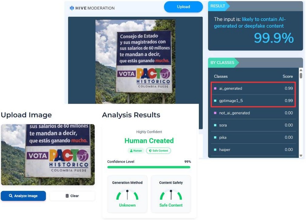 Sin embargo, la foto es falsa y presenta inconsistencias visuales que evidencian una posible manipulación con inteligencia artificial. El representante Toro ya había difundido una foto falsa similar, que tenía un mensaje sobre la Corte Constitucional por la suspensión provisional del decreto que declaró la emergencia económica y social para enfrentar el déficit presupuestal. En el mismo sentido, esta pieza antagoniza con el poder judicial como parte de la campaña política.