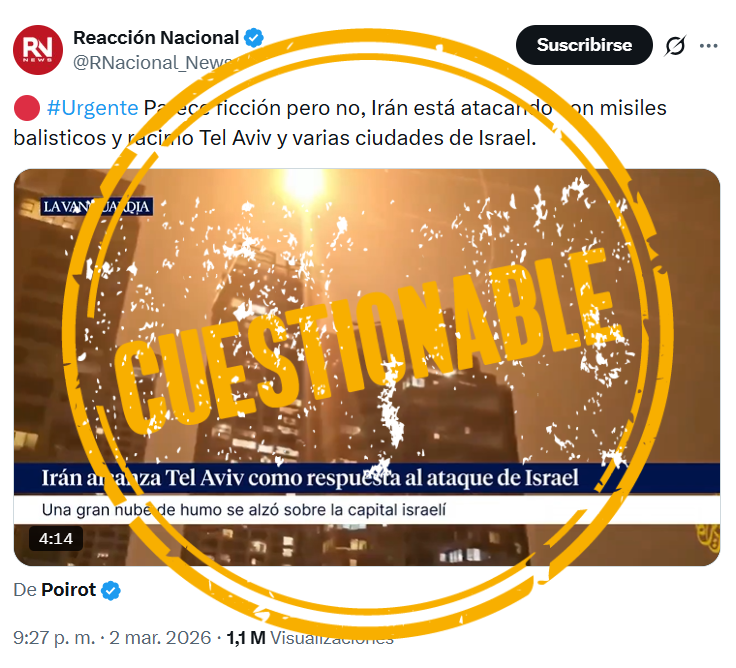 La grabación comenzó a compartirse en marzo de este año después del ataque de Israel y Estados Unidos a Irán y la respuesta de ese país. En X fue replicado por la cuenta Reacción Nacional (@RNacional_News), que hemos chequeado en varias ocasiones por desinformar, y ya acumula más de 1 millón de visualizaciones.