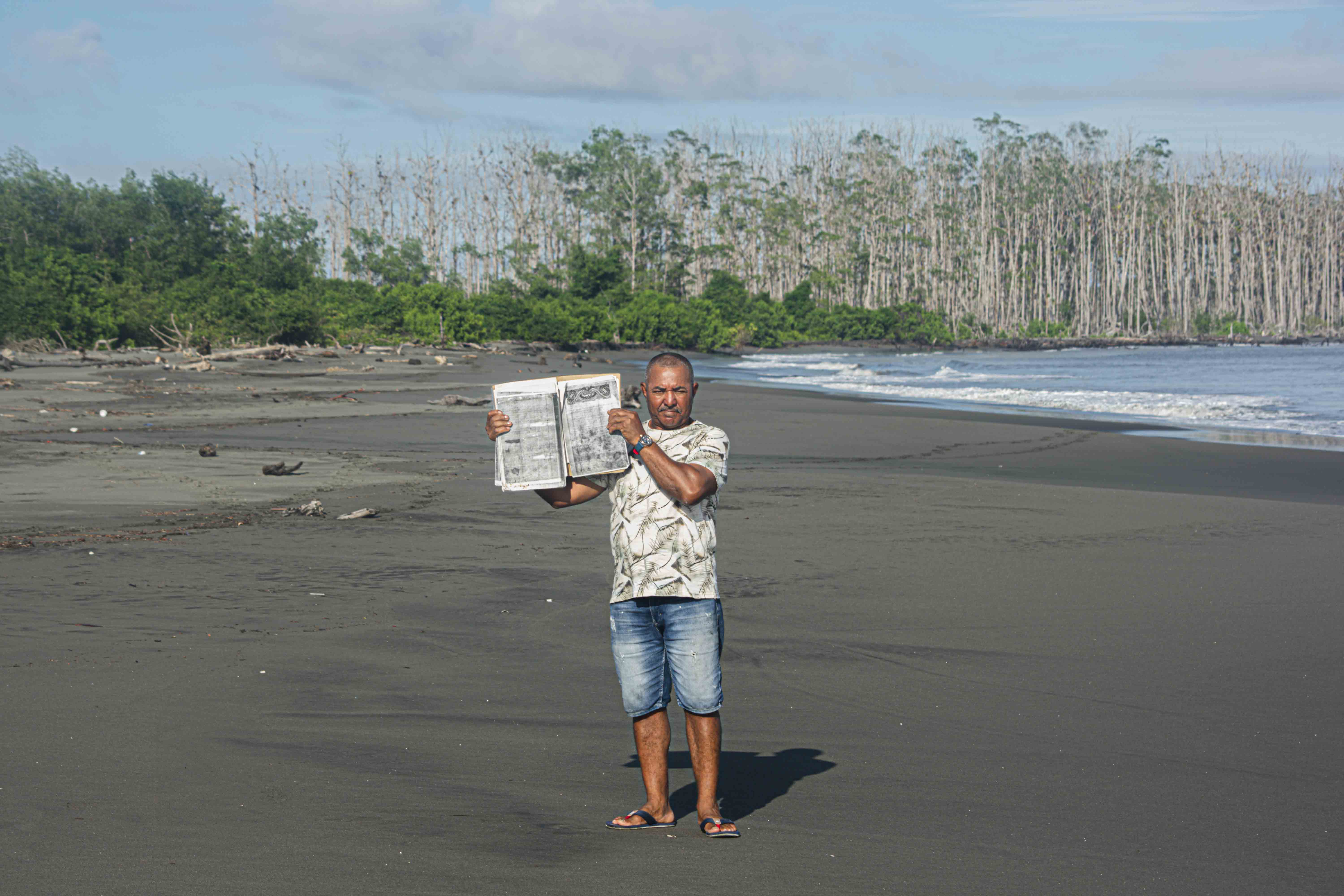 En la playa de Amarales, con Manglares deshojados de fondo, el representante legal del Consejo Comunitario Punta Mulatos, Robinson Campaz, sostiene una copia de la escritura de la propiedad colectiva de las playas hoy afectadas por la erosión, que data de finales del siglo XVIII, cuando el territorio era más grande. Fotografía: Manuel José Cárdenas Martínez.