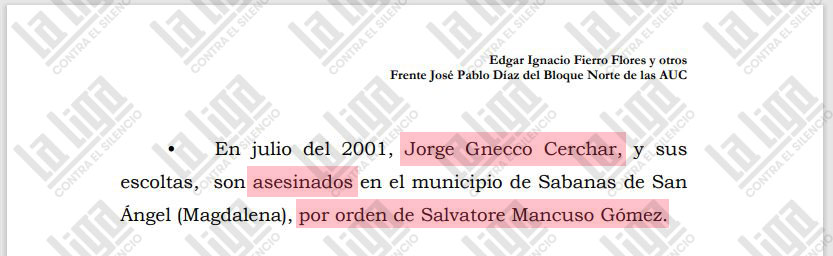 Incluso, el asesinato de Jorge Gnecco y sus escoltas, ocurrido en 2001 en la gallera del municipio Sabanas de San Ángel (Magdalena), fue confesado por exparamilitares por presuntas cuentas pendientes del tráfico de drogas. “Este señor Gnecco fue asesinado por la organización, ordenado por ‘Jorge 40’, Mancuso y Vicente Castaño al parecer por unas cuentas de narcotráfico. Quiere decir esto que el señor Jorge Gnecco formaba parte de la organización. Claro, aparte manejaba el gremio de transporte, gremio ganadero y empresarios en Santa Marta y Valledupar, y aparte de todo se manejaba en la política”, declaró Óscar Ospino Pacheco, alias ‘Tolemaida’, ante una Fiscalía de Justicia y Paz.