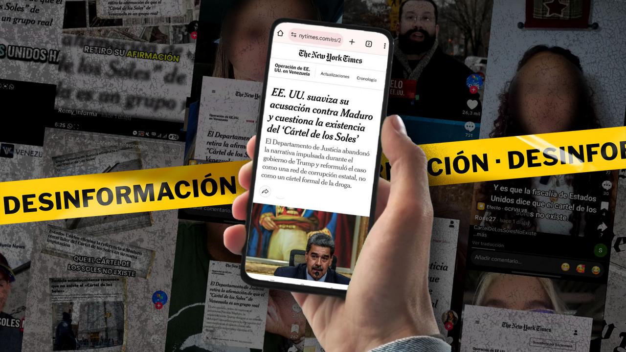Como parte de la campaña desinformadora, varios de estos actores están presentando de forma descontextualizada el texto de la acusación, asegurando que el Departamento de Justicia “negó” la existencia del Cartel de los Soles como una estructura criminal, y amplificando coordinadamente el titular de un artículo publicado el pasado martes por The New York Times para brindarle un aire de legitimidad a la narrativa.