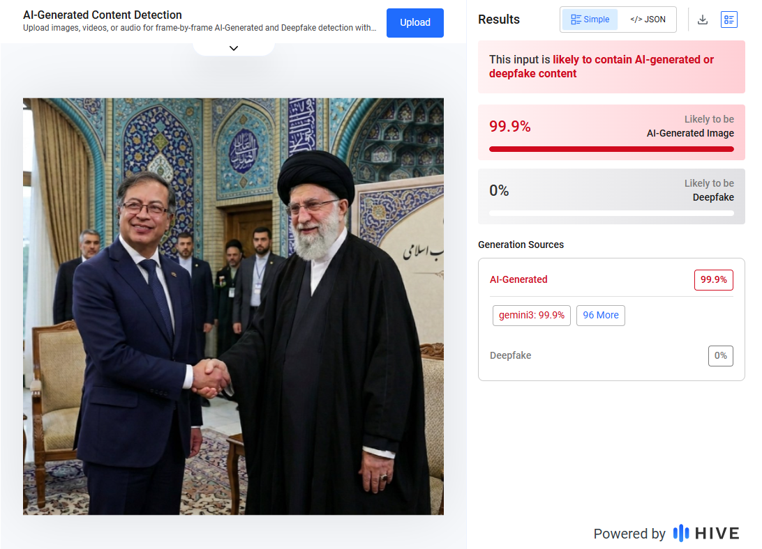 Es falsa. No hay ningún registro en internet que confirme que Petro se reunió con Ali Khamenei ni que viajó a Irán. Por el contrario, detectores de inteligencia artificial arrojaron que fue creada con esa tecnología.