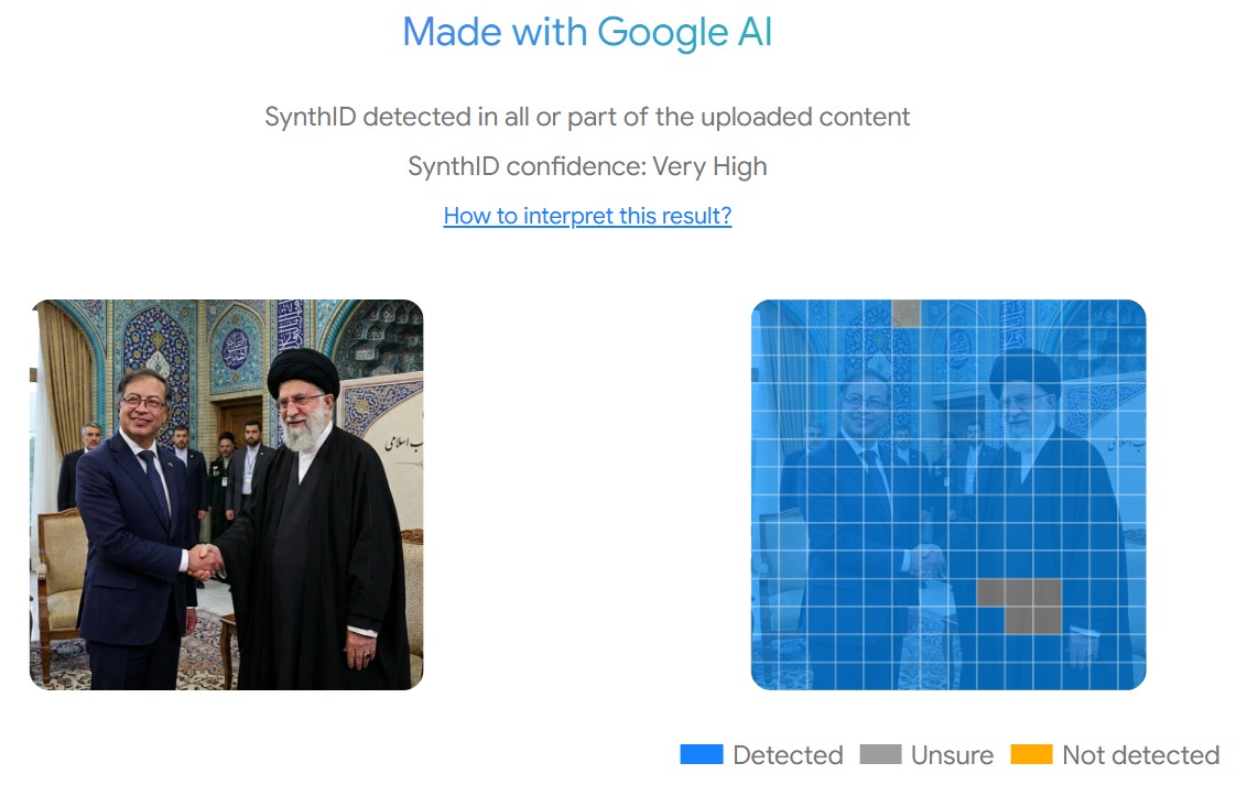 Para confirmar esa información, analizamos nuevamente la foto falsa con SynthID Detector, una herramienta que identifica marcas de agua digitales imperceptibles a simple vista que Google añade a los contenidos creados por sus modelos de IA. Esta arrojó que en efecto fue creada con Gemini.