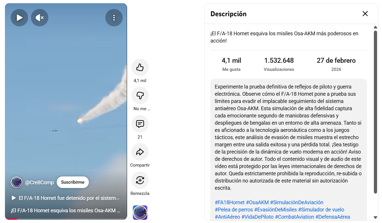 Con esa información, hicimos una búsqueda en YouTube con las palabras “F/A-18 Hornet Dodges Osa-AKM War Thunder” y encontramos que el video que estamos chequeando fue publicado originalmente el 27 de febrero, un día antes del ataque de Estados Unidos e Israel, por la cuenta Creative Comparison.