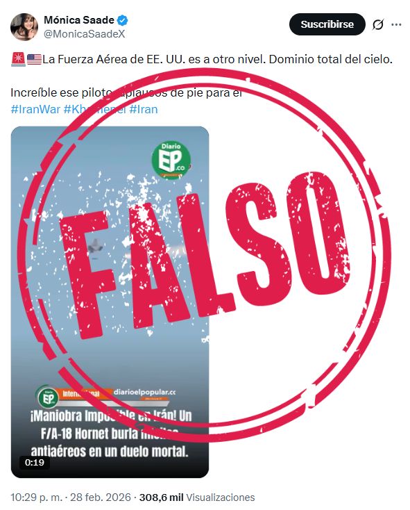 El video falso circula en internet desde el 28 de febrero, tras el ataque de Israel y Estados Unidos a Irán y la respuesta de ese país. Una de las publicaciones en X fue hecha por el usuario Luis Aníbal Rincón Arguello (@Rincon001A), a quien ya hemos chequeado en varias ocasiones por desinformar, y ya acumula más de 4 millones de vistas. La usuaria Mónica Saade (@MonicaSaadeX), que ha desinformado antes, también compartió el video.